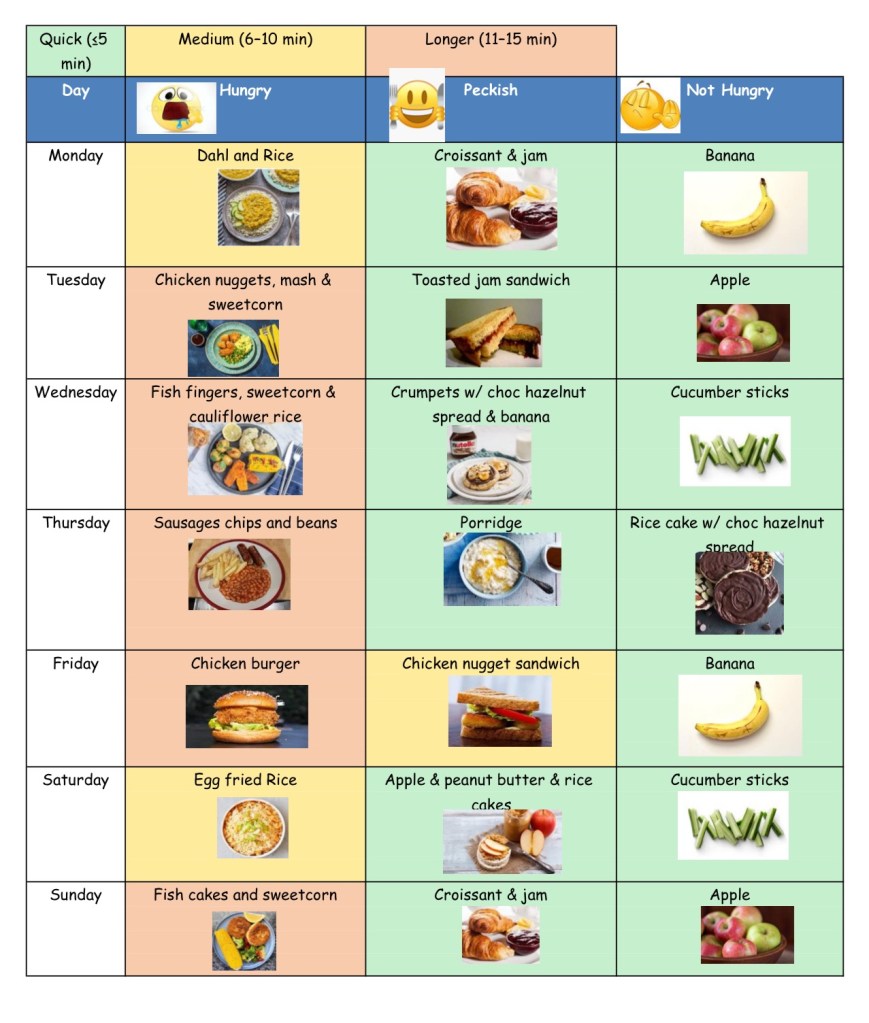 The colour coding shows how long the meals take to cook. Red = up to 30 minutes (forever, if you’re a hungry seven-year-old). Yellow = up to 15 minutes. Green = no cooking at all (basically, “here—have a banana”). The pictures help her recognise what she’s being offered.