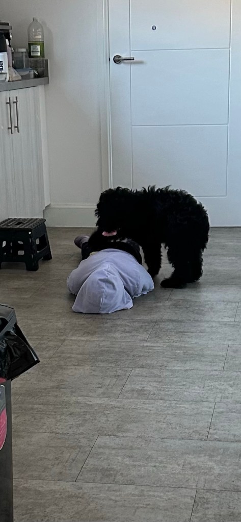 That’s all very well but he prefers chewing on the squishy body temperature bits. She asked us to explain this to our fae, which we did. She locked on to the ‘play dead’. That bit she got sort of, to the point where I heard her snap ‘no’ at the dog, followed by a thump and some scrabbling. When I turn around she is laying on the ground, completely face planted like a planking statue while the puppy scrambles around trying to determine if this is some sort of game, a threat or if some awful ailment has just overcome his favourite playmate. I needed to leave to stop laughing. On the plus side it did stop him mouthing so I guess it worked, on the down side she now makes like a swoons like a Victorian heroine if he even opens his mouth.
